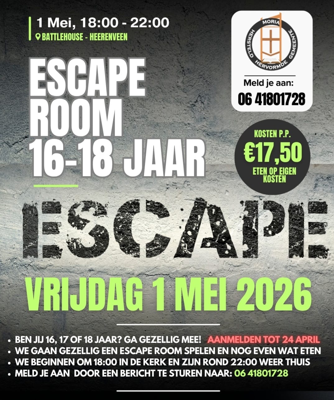 Ben jij 16, 17 of 18 jaar oud? Ga vrijdag 1 mei gezellig mee! De kosten zijn € 17,50 p.p. Na de tijd gaan we even langs de Mac, dit is op eigen kosten. We...